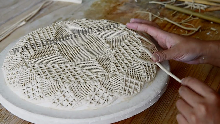 把泥土制作成泥條,泥條的軟硬程度要合適,以便于制作鏤空的盤子,鏤空盤子制作是按照模具來編織滴,制作一個大概要3-4個小時左右。