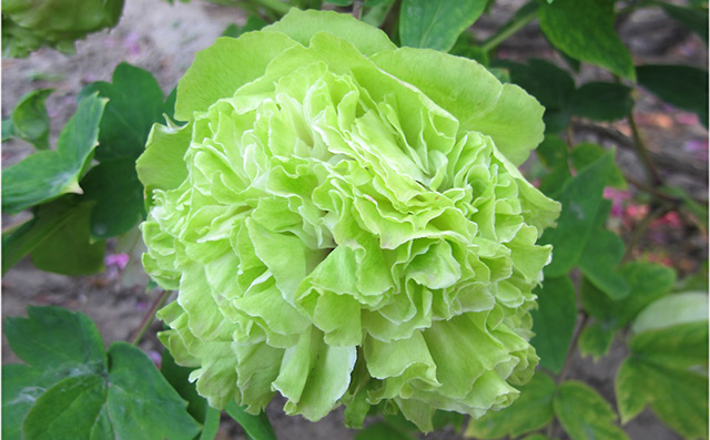 豆綠:牡丹四大名品之一。落葉灌木。莖高達(dá)2米;分枝短而粗。葉通常為二回三出復(fù)葉,頂生小葉寬卵形,表面綠色,無毛,背面淡綠色,有時具白粉,沿葉脈疏生短柔毛或近無毛。此花為世間稀有名貴品種。栽培供觀賞。