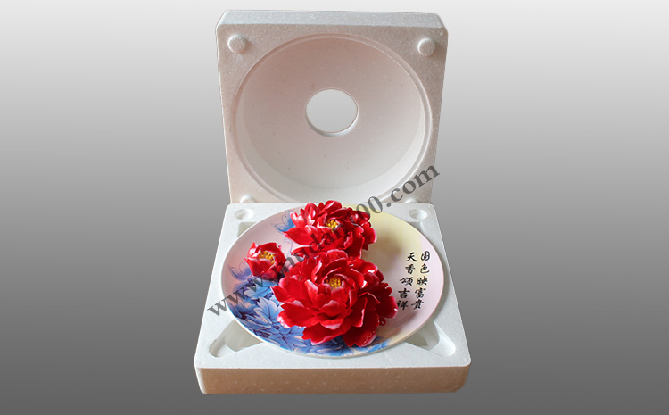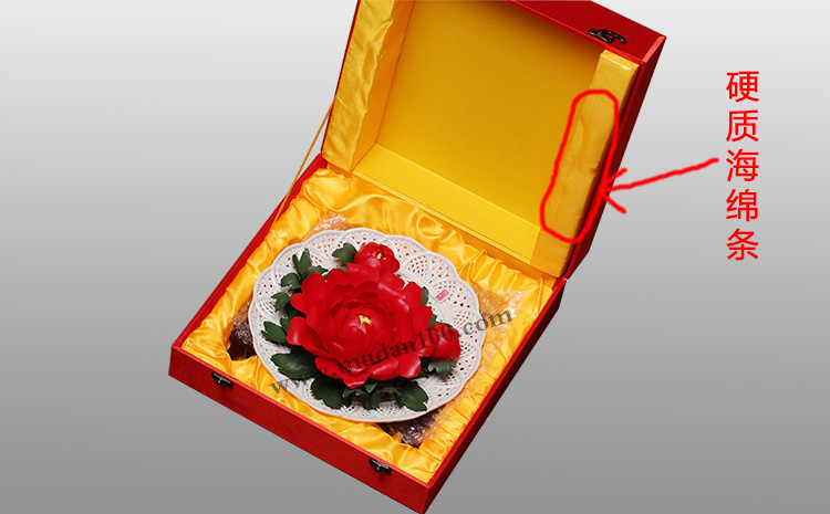 大部分牡丹瓷都是禮盒(如下圖)包裝,固定牡丹瓷盤的只有兩邊的硬質海綿條,這樣的固定日常送禮手提還行。但是直接用禮盒+外面紙箱包裝是不行的,快遞運輸中轉比較暴力,尤其是牡丹瓷的陶瓷花瓣,瓷片很薄,只要受到大一點的外力很容易破碎。我們以前禮盒發貨發10個能損毀8個,欲哭無淚啊。